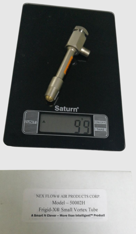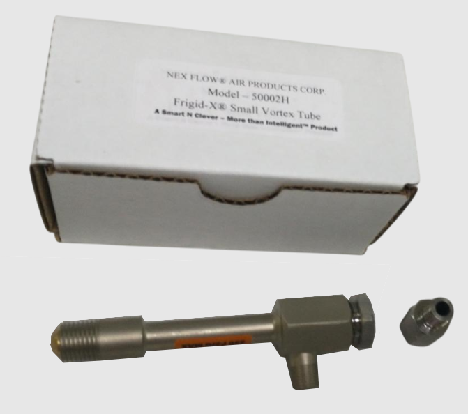 50002H Миниатюрная вихревая трубка с генератором 59002H, расход воздуха - 57 л/мин (2 CFM) при 6.9 Бар, мощность охлаждения 42 Вт (145 BTU/час), резьба: 1/8" NPT наруж., материал генератора: латунь, материал корпуса: нерж. сталь, в комплекте с переходником резьбы 1/8" NPT внутр. на 1/8" BSPT наруж., материал: нерж. сталь. Масса 99 гр.