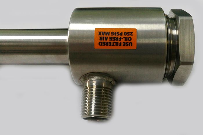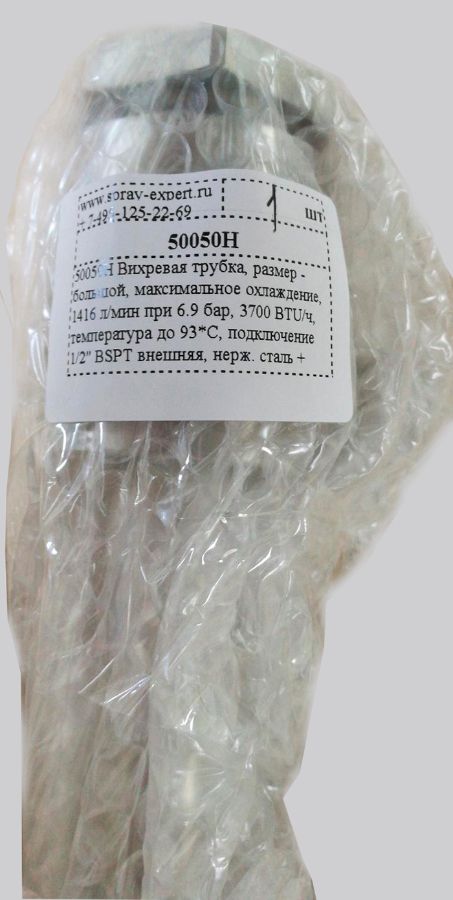 50050H вихревая трубка компании NexFlow, размер - большой, расход 50 CFM (1416 л/мин) при 6.9 бар, производительность по холоду: 3700 BTU/час (1084 Вт), резьба 1/2" NPT наруж., материал: нерж. сталь, генератор: латунь, в комплекте с переходником резьбы 1/2" NPT внутр. на 1/2" BSPT наруж., материал: нерж. сталь.