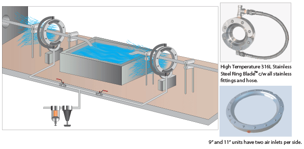 Кольцевые воздушные ножи – это практически те же воздушные ножи только в виде замкнутых колец. Они сконструированы как две отдельные части с шарнирным соединением для того, чтобы воздушные ножи могли открываться и закрываться вокруг экструдированной или движущейся детали. Эти устройства используются как эффективная система продувки для всех видов экструзии – проволока, кабельный канат, оконные профили, автомобильные бамперы, экструдированные трубы и для другое.