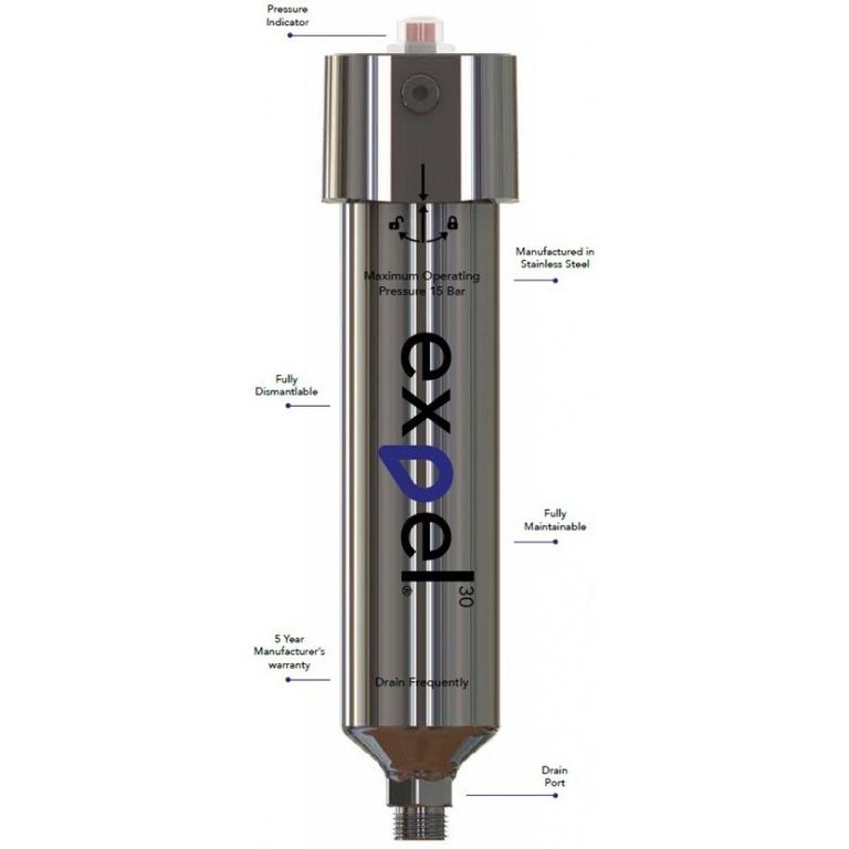 Фильтр частиц воды и масла EXPEL Water, Oil and Particulate Filter радикально улучшает производительность систем сжатого воздуха в промышленности. Уникальный патентованный дизайн позволяет эффективно удалять до 99,9999% жидкостей, масла и воды.