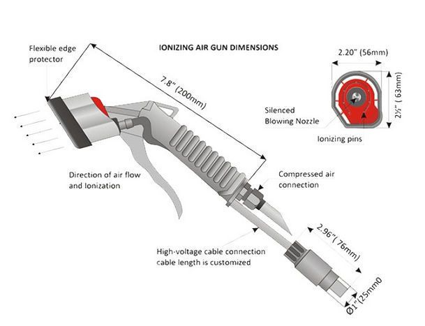 Если вам необходимо ручное устройство для удаления статических электрических зарядов, наш ионизирующий распылитель воздуха – идеальный продукт. Важнейшими чертами следует считать его эргономический дизайн, вес и гибкость. Кабель должен быть полностью изолирован, в том числе антистатически, чтобы обеспечить долговечность работы