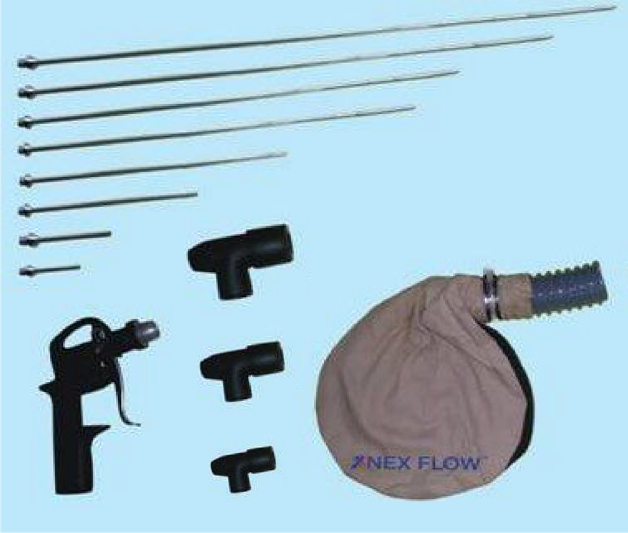 Система очистки глубоких отверстий Nex Flow Blind Hole Cleaning System была разработана для обеспечения безопасности и минимазации рассбрасывания мусора. В некоторых похожих системах форсунка продувает отверстие, а выдуваемый материал захватывается пылесосом для утилизации. Однако, такое устройство не очень эффективно, поскольку продувочный воздух сталкивается с действием вакуума.