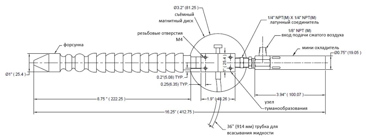 58208 Система охлаждения инструментов влажным туманом Nex Flow Sub Zero Vortex Mist Coolant System состоит из миниатюрного точечного охладителя Frigid-X Cooler 56008F, магнитной основы 99929L и комплекта для создания влажного тумана 58008. |