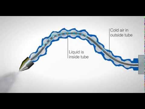 Жидкость охлаждается с помощью небольшой вихревой трубки, которая потребляет примерно 142 л/мин воздуха при максимальном давлении в 3.5 Бар. Давление можно увеличивать или уменьшать для предотвращения замерзания жидкости или для понижения температуры. Регулировочный винт контролирует количество тумана. Жидкость нагнетается в устройство через длинную пластиковую трубку, подсоединенную к основной установке.